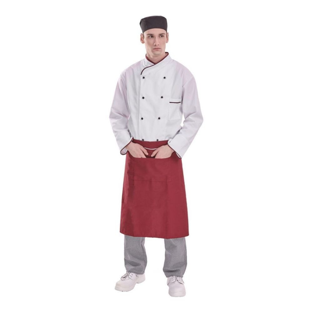 Szakácskabát kétsortos gombolású, bordó díszcsíkkal